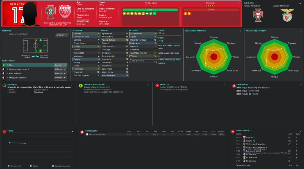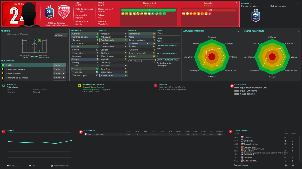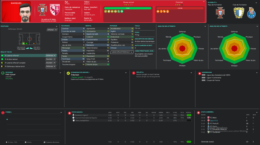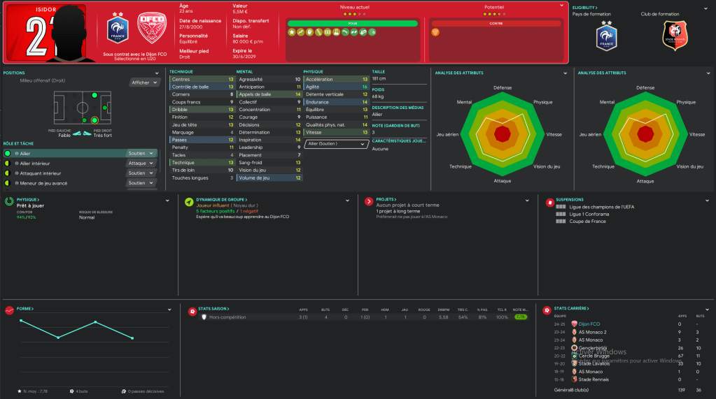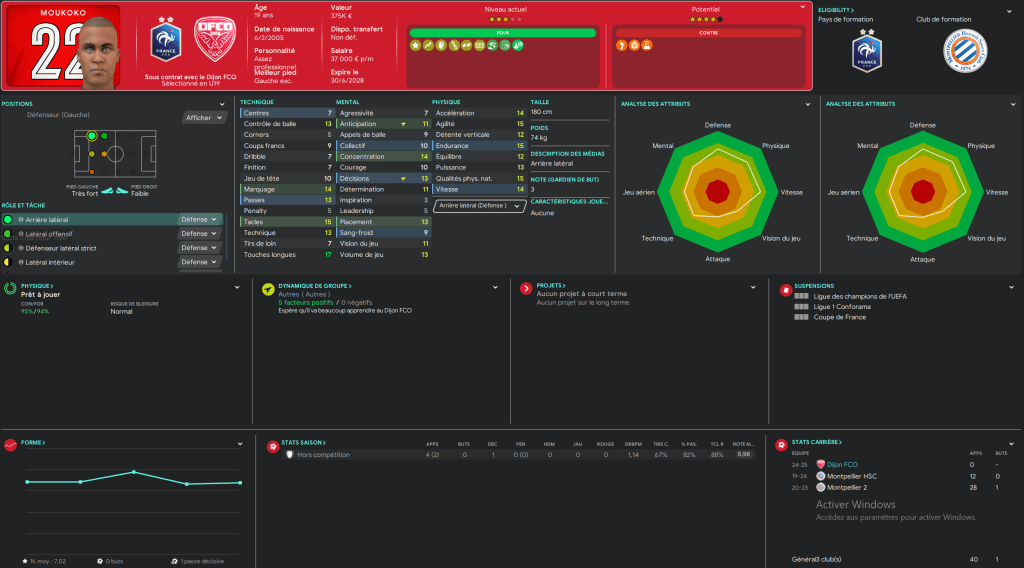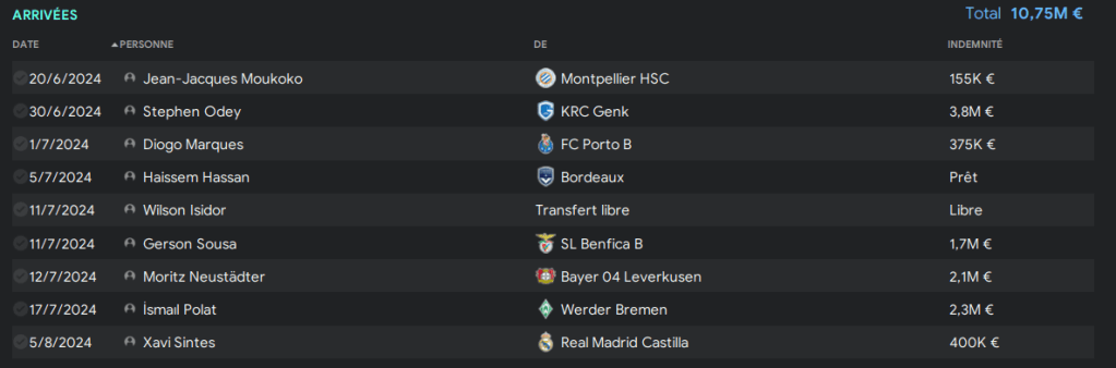 Du côté des arrivées au club ma première priorité a été d’acheter un défenseur latéral, car je n’en avais plus d’assez performant. De plus, avec la ligue des champions approchant je voulais donner priorité à des joueurs français pour les quota. Mon choix c’est donc porté sur Jean-Jacques Moukoko qui n’a certes pas fait une bonne saison l’année dernière, mais celui-ci été sur la liste des transferts, à un potentiel intéressant et un niveau plus que correct pour un joueur de 19 ans.