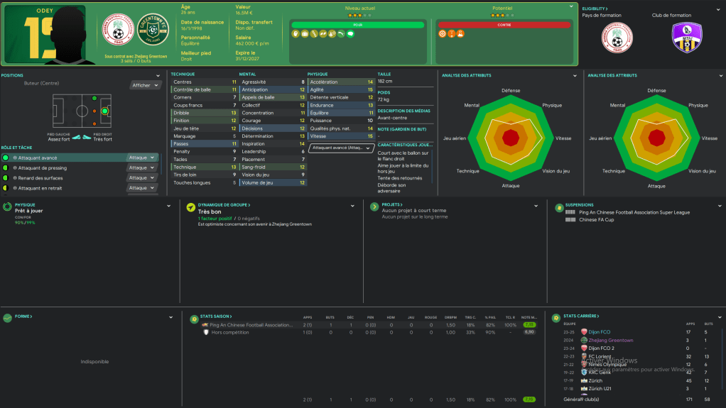 J’ai également l’arrivée définitive de Stephan Odey qui nous vient de Genk après avoir validé son prêt avec la lever de l’option d’achat. Ce que je n’avais pas prévu est la mise en vente de Moritz Neustädter (foutu nom allemand) sur la liste des transferts du Bayer 04 toujours un jeune de 19 ans très bon pour son âge, je crois que la concurrence entre lui est Vassi va être rude. Toujours est-il que j’ai donc décidé de vendre Stephan à nos nouveaux vassaux … eu partenaire de Chine pour 2.25 fois son prix d’achat.