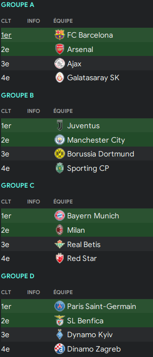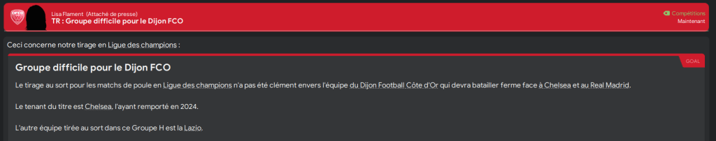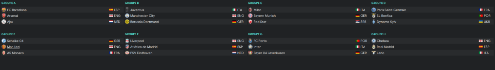 Le tirage a été extrêmement intense, je voyais les équipes remplir les groupes A à F. Il ne restait que 2 équipe le Ferencvarosi TC une équipe hongroise et nous, puis la décision tombe groupe H. Moi qui pensai faire une superbe saison et remporter un maximum d’argent en LDC je me retrouve dans le groupe de la mort dans lequel je ne me vois même pas viser la 3eme place synonyme de Ligue Europa.