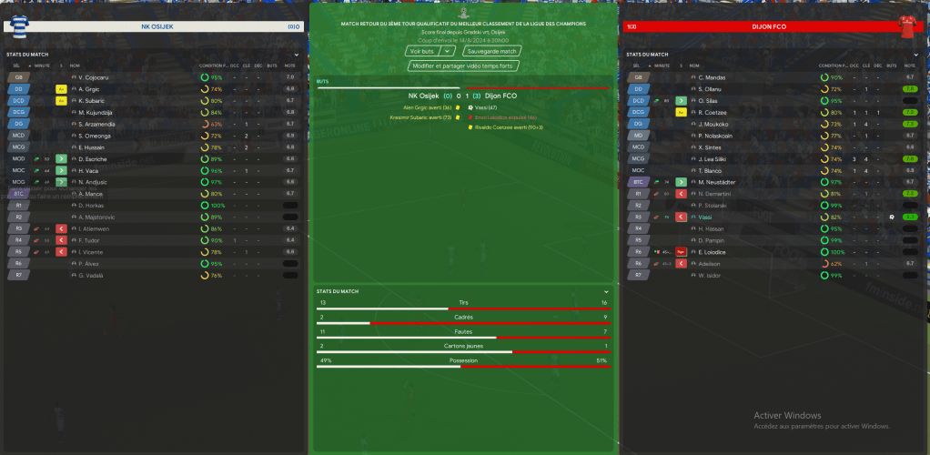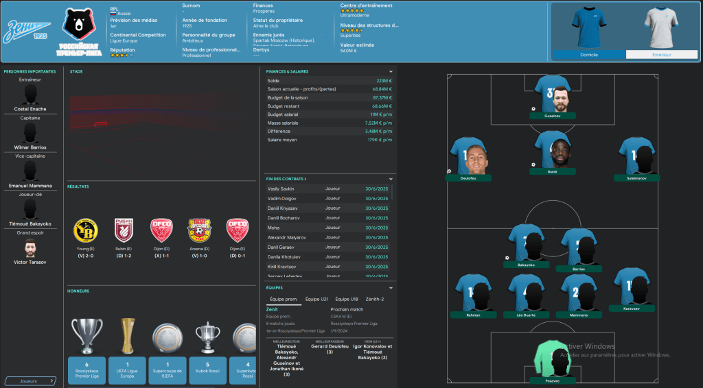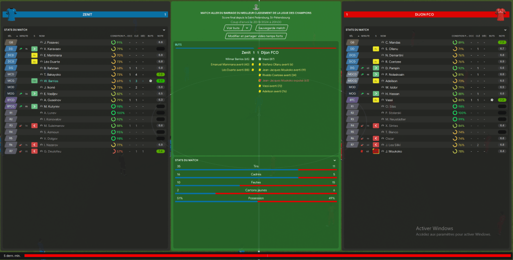 85eme minutes corner en faveur du Zenit. Mandas, impérial dans sa surface capte le ballon cours pour et relance dans les pieds de Vassi dans les 30 deniers mètres du Zenit, il réussit à éliminer son chien de garde avant de se retrouver seul face au gardien, il envoie un boulet de canon qui est arrêté par le gardien russe mais la puissance de la balle a été tel qu’il n’a pu que le repousser, le ballon reviens donc dans les pieds de mon jeune prodige et arrive ajuste sa deuxième frappe à ras du poteau le gardien est battu et c’est l’égalisation !!! J’étais fou l’entraîneur russe bien que je ne comprenne rien à cette langue n’avait pas l’air bien contant de la suffisance dont ses joueurs ont fait part. Malgré 3 autres grosses actions pour le Zenit nous sommes parvenus à maintenir le score à 1-1 ce qui est un résultat EXCEPTIONNEL à l’extérieur que personne n’attendait.